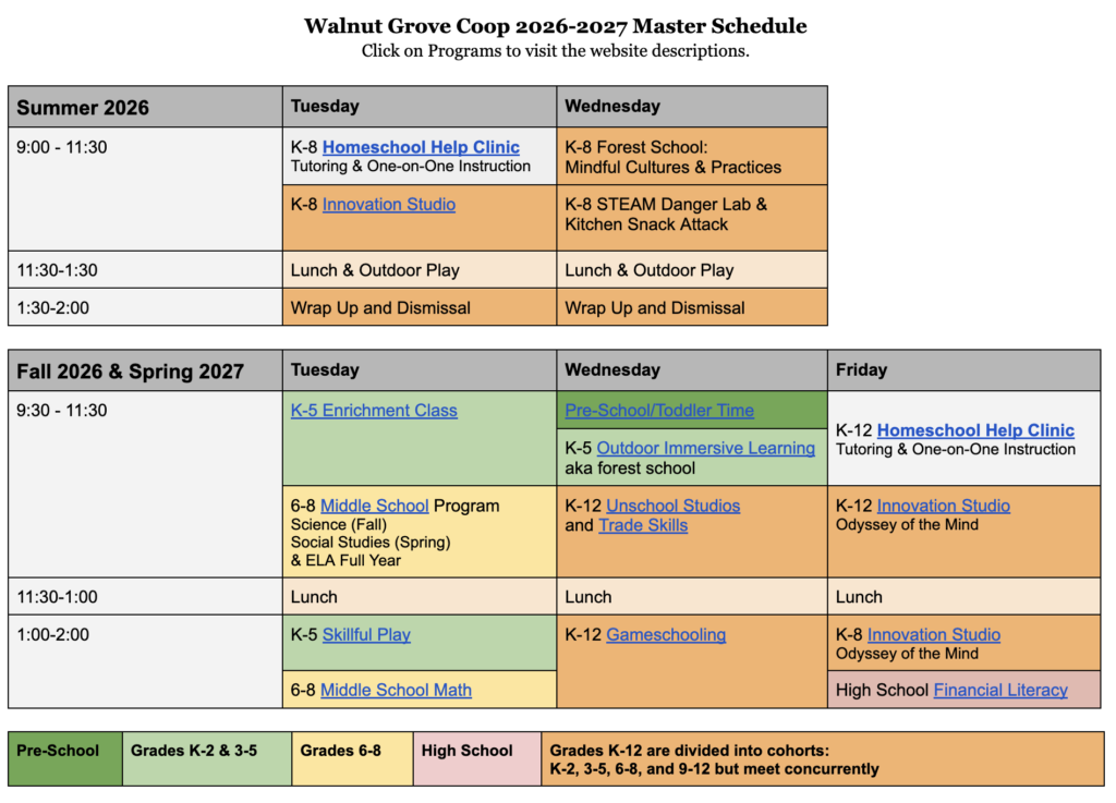 There are several ways to participate in the activities at Walnut Grove Coop. All members pay a $60 membership fee annualy to participate in the group and its programs. Member fees are per child. Adults and children under 1 year are free.